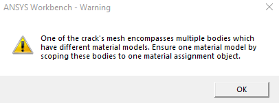I do not know how to solve this error. i am not getting this error in another 3D model with one material. How can i resolve this error so i can be confident on the resulting values. however, SIF results are comparable to another 3D model. so i can just ignore it. But then again, when i find SIF for extended crack going into second material (long crack), i am getting the lower SIF then SIF for shorter crack and that makes me reluctant to just ignore the error. (second material has transverse isotropy and higher E than first material ) .