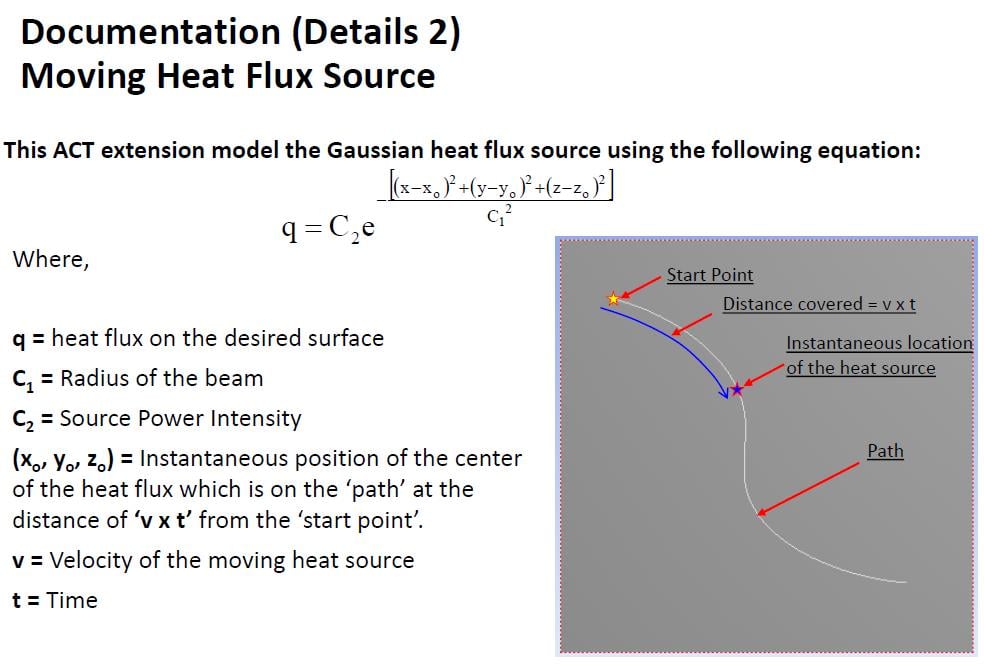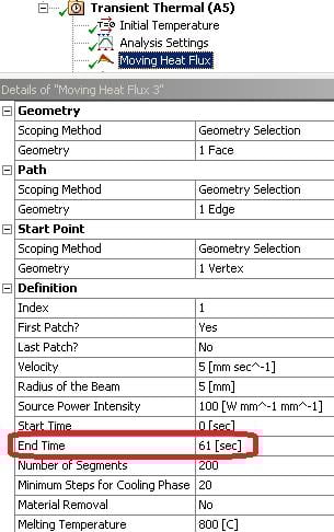 I've just confirmed that the error is nothing to do with an incompatible version of ACT extension. This act extension also contains source code so you can load it in any ANSYS version without any issue. Â Now, regarding this error, try to check the max end time on the last moving heat definition is more than 'Path length/Velocity'. It could be the highest next whole integer and make sure 'Step End Time' under Analysis setting is more than the highest 'End Time' defined in 'Moving heat flux'.