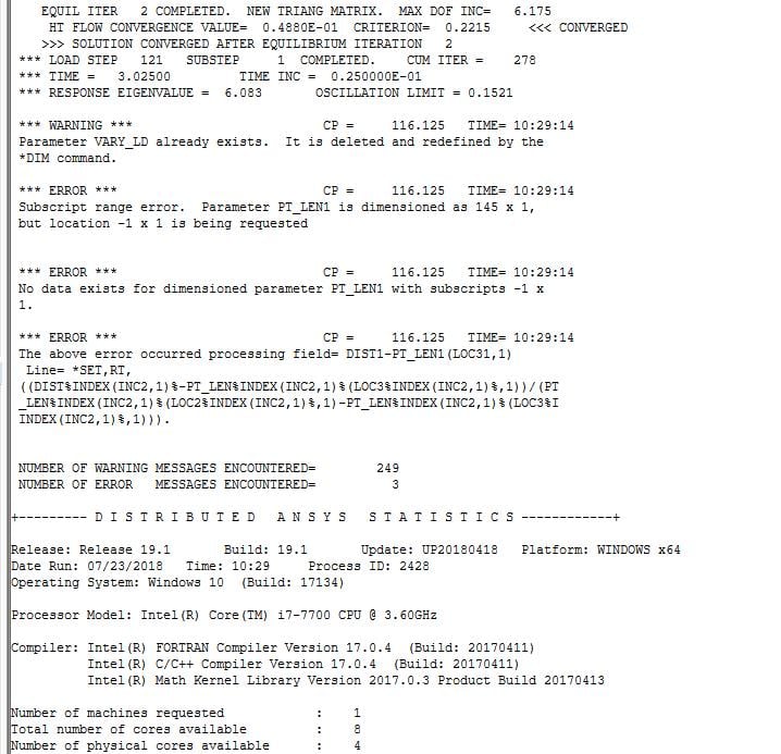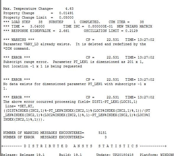 SubscriberThanks Sandeep. I just got access to the ACT so I have been trying to use the Moving Heat Source extension (I am running ANSYS 19.1). I keep running into issues in the provided code such as that shown in the attached image (from the solution information output). I am using some of the main input parameters for the moving heat source, so I am wondering if you have any suggestions for working with the plugin, or if there is a much depeer issue going on. Perhaps you might have some strategies or best practices for debugging issues such as these. Seems like there are lots of "warnings" that occur when using this plugin.