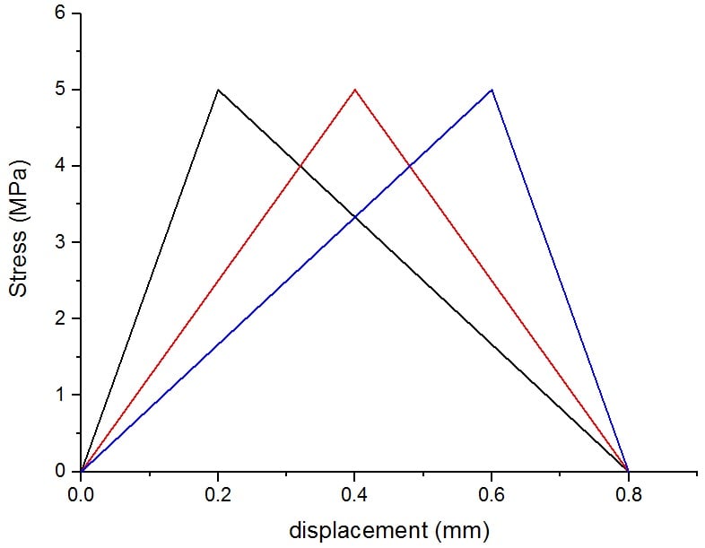 (a). If I input the above mentioned parameters for CZM (i.e. C3,C4,C5) then how does the Ansys solver differentiates between the following curves? The values for the following curves are imaginary which I made up to ask my confusion. In the curves below, all of the curves have same C3 and C4 values but the corresponding displacement or slip value of C3 are different. Noting that in Mode-II CZM we can only input the C3 and C4 and not the corresponding slip of C3. (for discussion let's call it Fig#2)