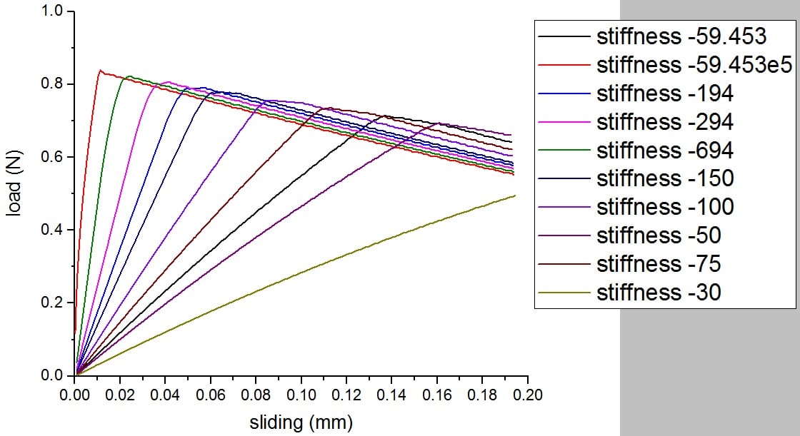 Based on the above equation if you are fixing the sliding distance (Tangential slip at the completion of debonding-C4) and decreasing the tangential stiffness (not directly but by decreasing the normal Stiffness FKN). then the bond/contact resisting force will absolutely decrease as shown in fig#3 and also this is common sense because if for example a lower stiffness adhesive is used as a glue between two materials then absolutely you will get a lower debonding force than if a higher stiffness adhesive is used giving that you assign them the same CZM input values (Bond stress & Slip).