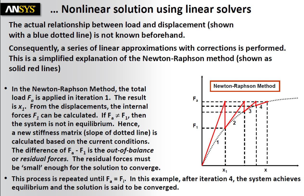 I'd like to know how Ansys computes the stiffness matrix at point x1 in figure. I'm studying the way in which Ansys uses the Newton-Raphson method when there are nonlinearities.