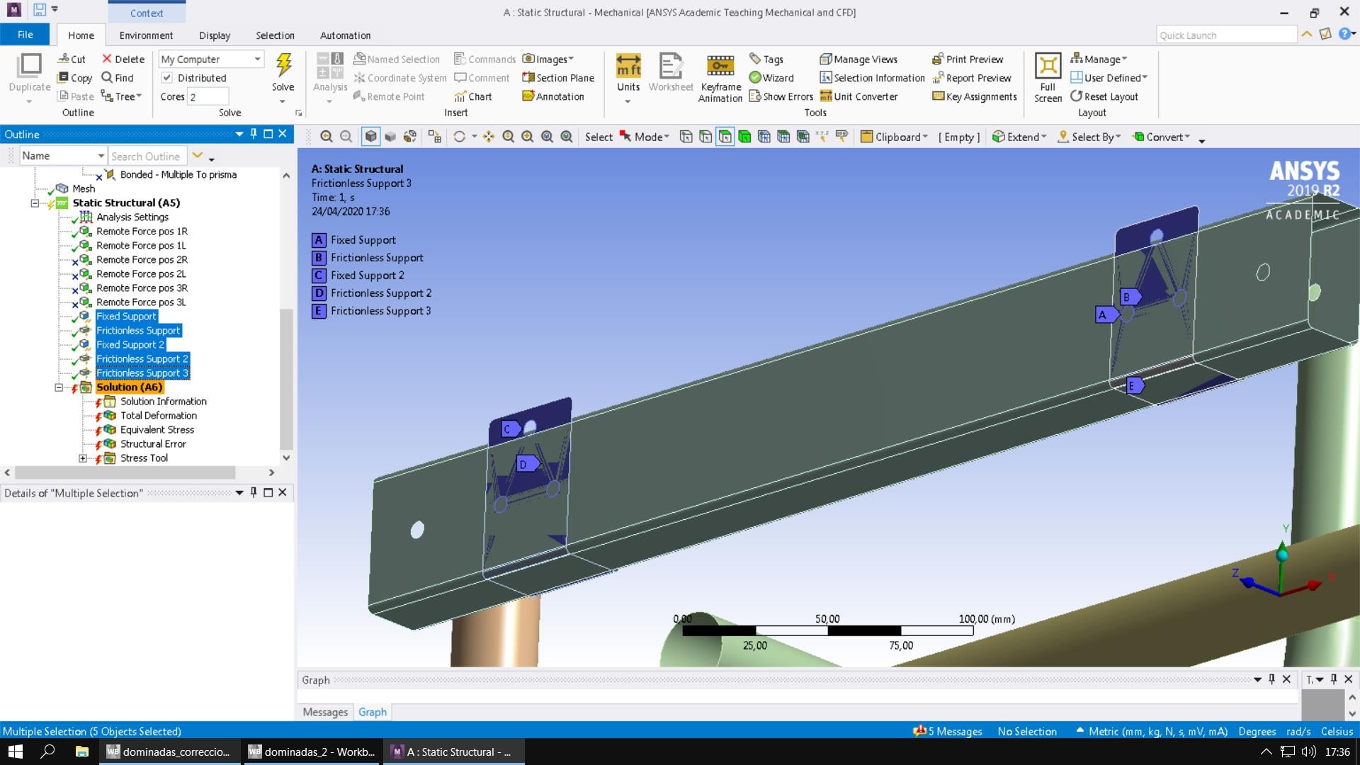 Respecto a las resctricciones, dado que estoy tratando con superficies, hay un fixed support para los tres orificios de cada soporte, los cuales van atornillados a la pared, y sobre las caras del soporte que está en contacto con la pared un frictionless support para cada soporte: