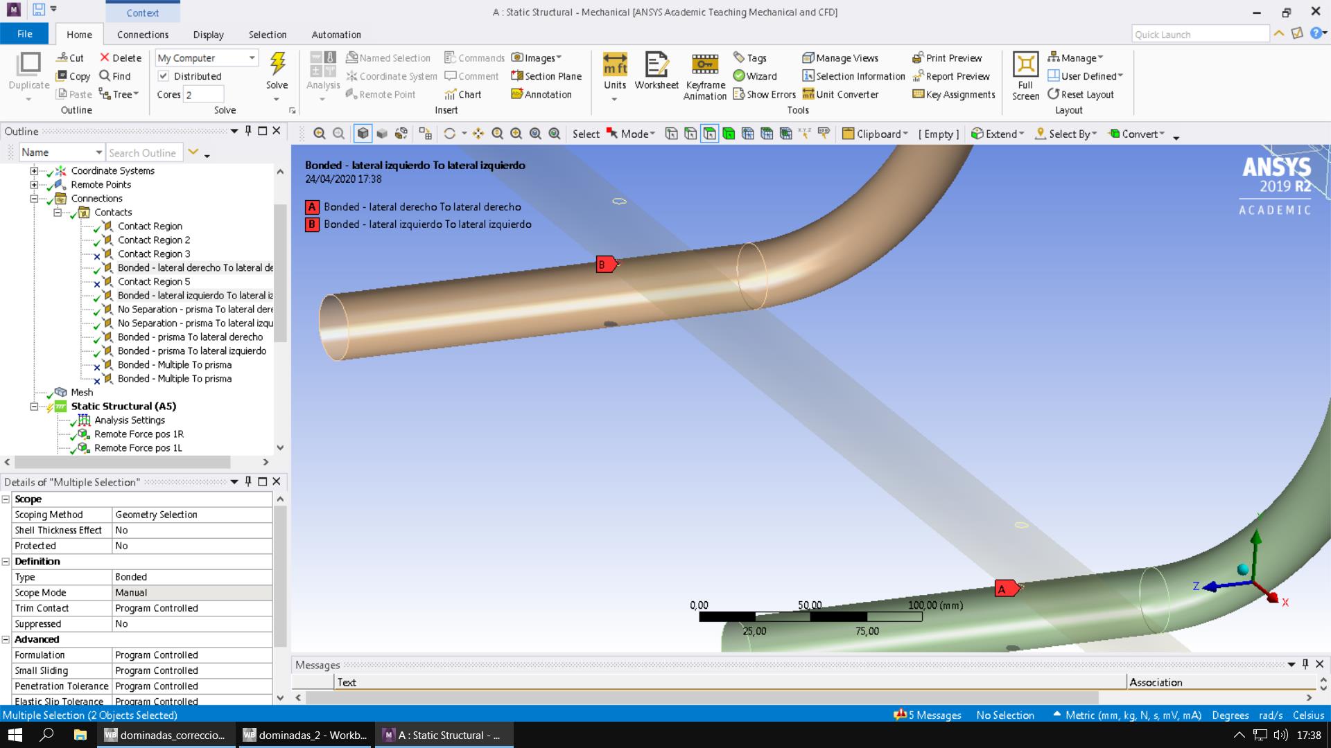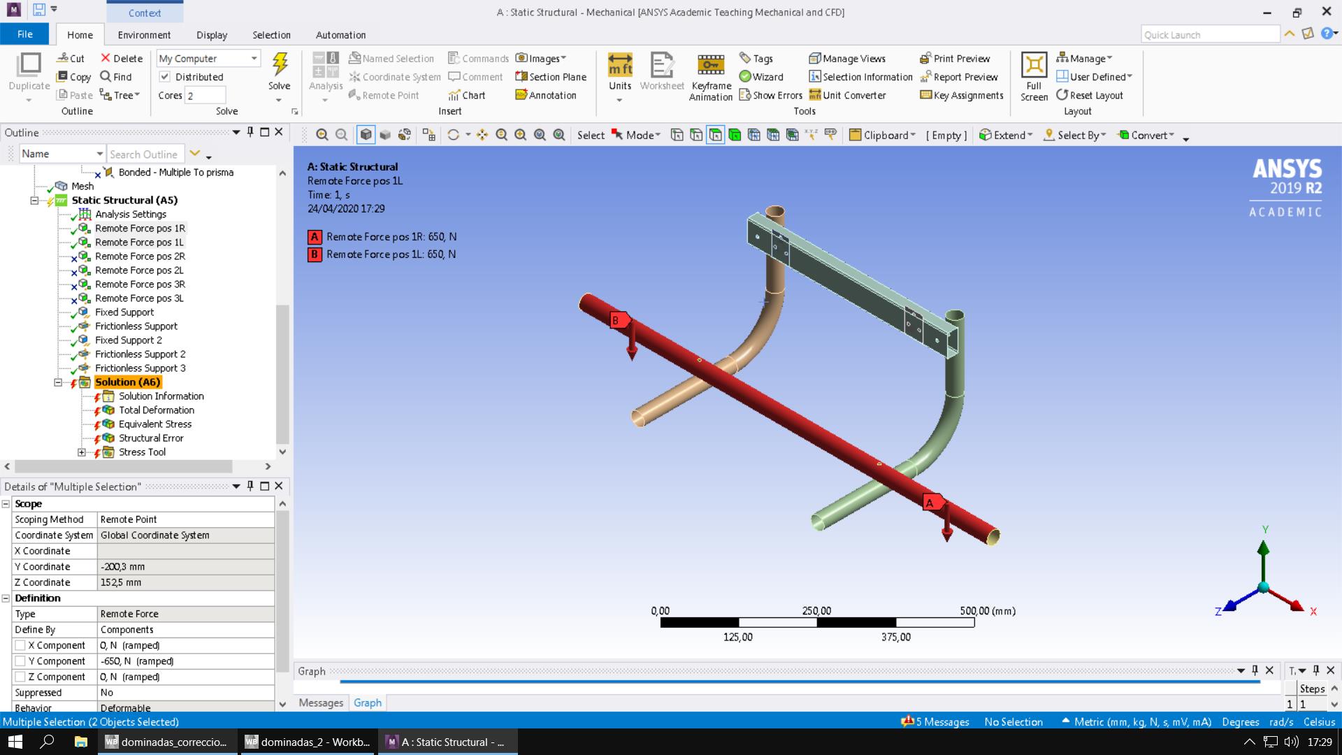 Hello everyone, I am doing a university work that I have to deliver before May 15, which consists of reproducing the behavior of a traction bar like the one in the images or in this link https: //www.decathlon. en / en / p / traction-bar-cross-training-muscle-pull-up-bar-500-cm / _ / Rp-142047? mc = 8353820 # zoom = opened. The problem is that this error appears to me and I don't know how to solve it: Solver pivot warnings or errors have been encountered during the solution. This is usually a result of an ill conditioned matrix possibly due to unreasonable material properties, an under constrained model, or contact related issues. Check results carefully.