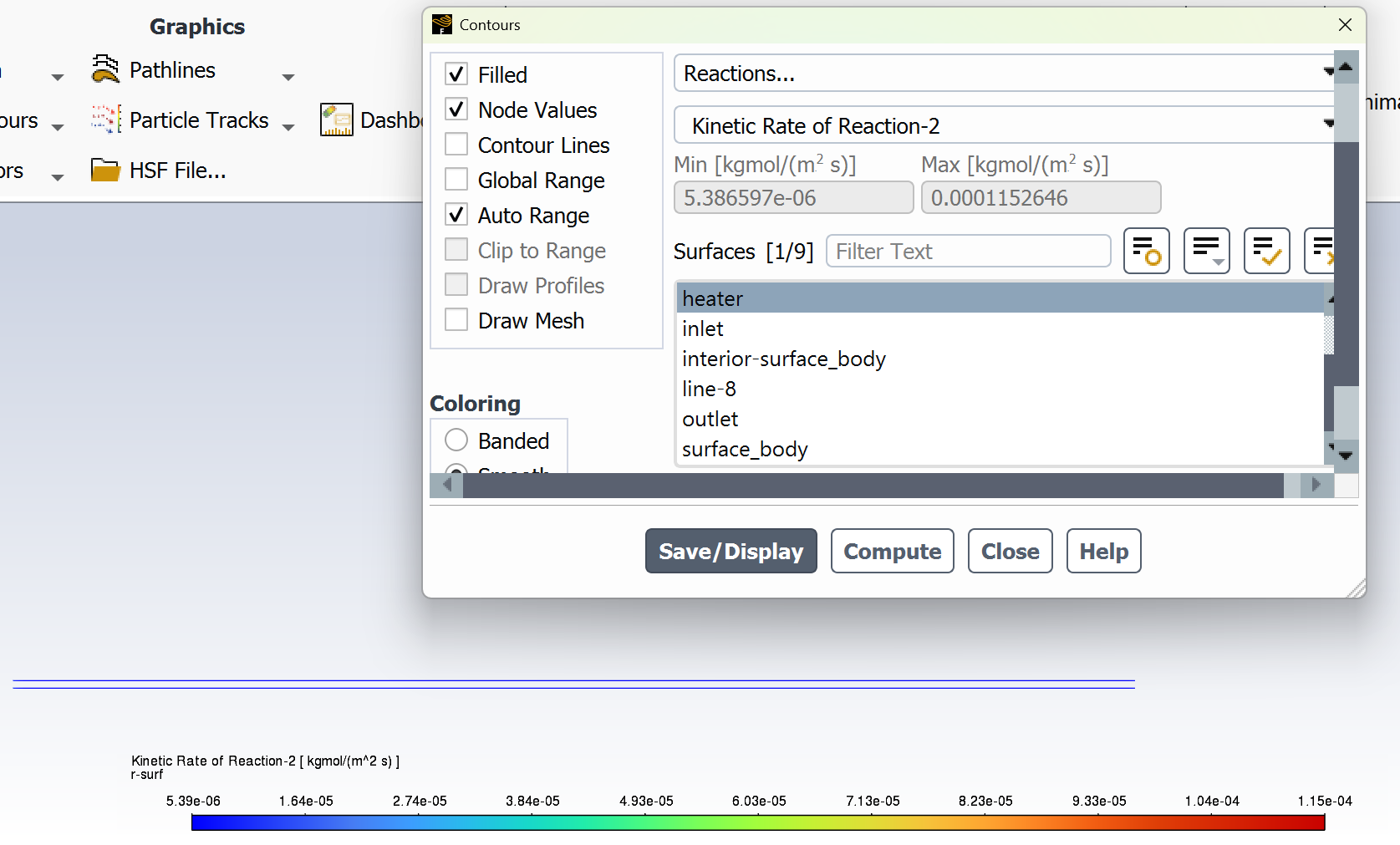 SubscriberI am trying to simulate ammonia decomposition through a channel 4 mm in diameter and 1 m long. The walls of the first 10 cm are set to 300 K, the next 60 cm are set to an elevated temperature that I am varying, and the last 30 cm are also set to 300K. The inlet flow is an ideal gas 1:1 molar mixture of NH3 and N2. The velocity inlet is set to a value such that the average velocity through the hot section is about 7.7 cm/s (what was done in the paper linked later) so the turbulence model was set to laminar. The operating pressure is set to 101325. I have a gas-phase reaction, and I have two sets of surface reactions for different materials (ruthenium for one and stainless steel for the other) to compare against each other. The surface reactions are applied to the hot walls only. The domain is 2D axisymmetric. The gas-phase and stainless steel surface reactions and the channel geometry are from a paper with the DOI: https://doi.org/10.1016/j.ijhydene.2023.04.106 while the ruthenium reaction was given to me by a colleague. The mechanisms are given below where the units for the pre-exponential factor are given in cm, mol, and s where applicable:Gas-Phase Mechanism (r_g=k*C_nh3):ELEMENTSH N NiENDSPECIESH2 N2 NH3ENDREACTIONS KJOULES/MOLENH3 => 1.5H2 + 0.5N2 1.01E7 0.0 240ENDSurface Mechanism for Stainless Steel (r_s=k_s*C_nh3):MATERIAL NI_CATALYSTSITE/Ni_SURFACE/ SDEN/0.1/Ni(S)ENDTHERMO300.0 3000.0 1000.0Ni(S) Ni 1 S 300.0 3000.0 1000.0 10.00000000E+00 0.00000000E+00 0.00000000E+00 0.00000000E+00 0.00000000E+00 20.00000000E+00 0.00000000E+00 0.00000000E+00 0.00000000E+00 0.00000000E+00 30.00000000E+00 0.00000000E+00 0.00000000E+00 0.00000000E+00 4ENDREACTION KJOULES/MOLE MWOFFNH3 => 1.5H2 + 0.5N2 3.1E5 0.0 116ENDSurface Mechanism for Ruthenium (r_s=k_s*C_nh3*C_ru):MATERIAL CATALYSTSITE/Ru_SURFACE/ SDEN/1.66E-9/Ru(S)ENDTHERMORu(S) Ru 1 S 300.0 3000.0 1000.0 10.00000000E+00 0.00000000E+00 0.00000000E+00 0.00000000E+00 0.00000000E+00 20.00000000E+00 0.00000000E+00 0.00000000E+00 0.00000000E+00 0.00000000E+00 30.00000000E+00 0.00000000E+00 0.00000000E+00 0.00000000E+00 4ENDREACTIONS KJOULES/MOLE MWOFFNH3 + Ru(S) => 1.5H2 + 0.5N2 + Ru(S) 1.5E16 0.0 128.0ENDHere is a screenshot of my Excel charts showing how rate constant and reaction rate compare with temperature when the pressure is 101325 Pa:A piece of the mesh towards the inlet is shown below:This is the chart from paper that I am trying to follow (they used Cantera for their simulations):The following contours, towards the end of the hot zone, are from a prematurely paused simulation when the hot walls are set to 700 K with the stainless steel catalyst enabled, which should cause a considerable surface reaction rate for both catalysts:As can be seen from the H2 mass fraction and surface reaction results, there is basically no surface reaction happening for either mechanism, even when I go up to 1000 K. For the ruthenium catalyst mechanism, I never had a problem up until this point until fairly recently. All I did recently was clean up the text files to make them easier on the eyes, and this is my first time using the stainless steel mechanism. There are no import errors for the mechanism, and the values of the kinetic parameters as they appear in the Reactions window in are good. Any help I can get would be greatly appreciated. -
