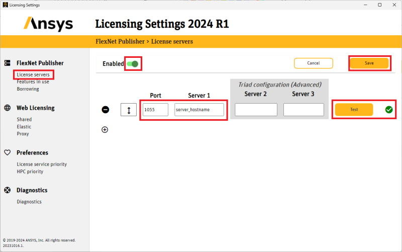 - "Test" the setting to confirm the license server configuration.Â