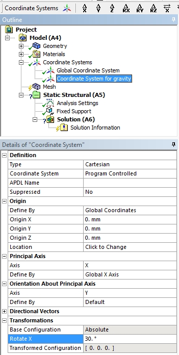 Click on Static Structural, on the Environment toolbar, click Inertial, Standard Earth Gravity. In the Details window, change the Coordinate System to the one you just created and renamed. You can pick which Direction you want.