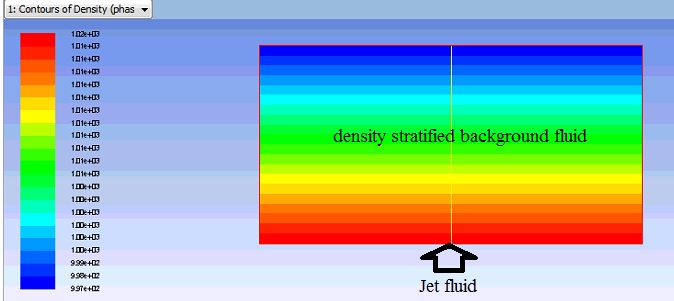 In my system, background density varies linearly from bottom (high) to top (low). Thereafter a jet of medium density is opened from bottom. So it should move up and at a neutral layer, the jet fluid should spread horizontally.