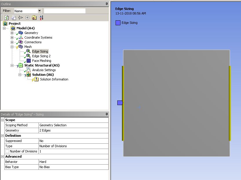 For generating a mesh of three equal element size of a rectangular geometry having length 3 meter and breadth 1 meter, I used edge sizing twice for horizontal and vertical boundaries.Thereafter I went for face sizing with element size 1m but am unable to see any mesh on the rectangular face.Kindly advise.