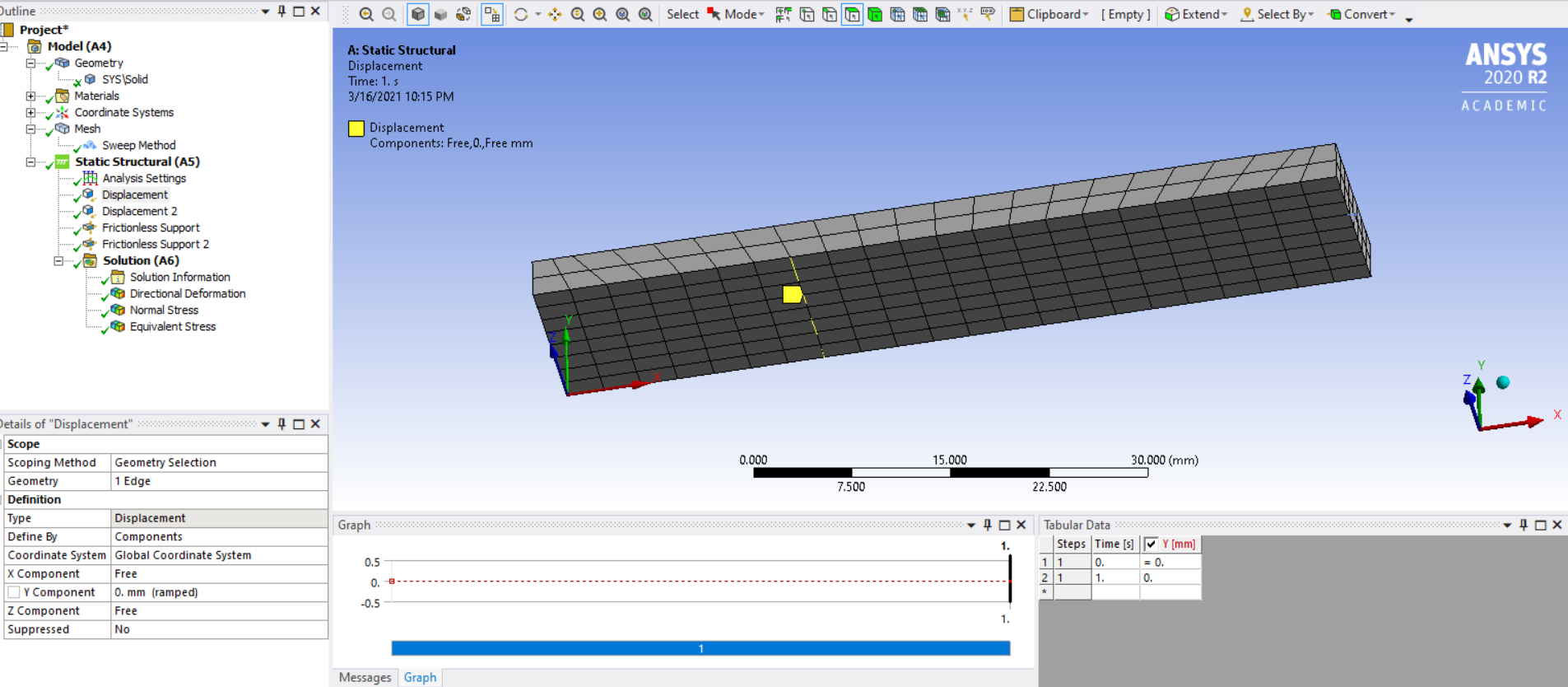 nI draw the geometry again and split the face 20 mm from origin and made a sweep mesh as u suggested. I applied Displacement as Boundary conditions. I want to match my results on workbench with Mechanical APDL. But unfortunately, I couldn't got the same results.nHere is the sweep method, however the generate the mesh with default element sizen