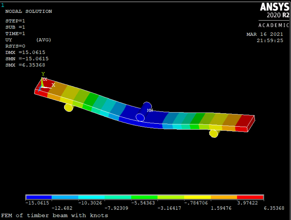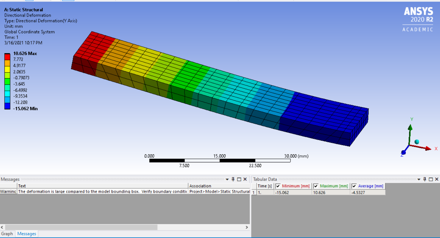 SubscriberHi Peter, nThank you for your response.nWell I didn't print my beam yet, however I have the previous orthotropic material properties. My friend did the simulation using ansys APDL where he used 3 solid rods, 2 as supports and one as pusher and the support is far 20mm from the origin. he got the following resultsnDeformation in Y n