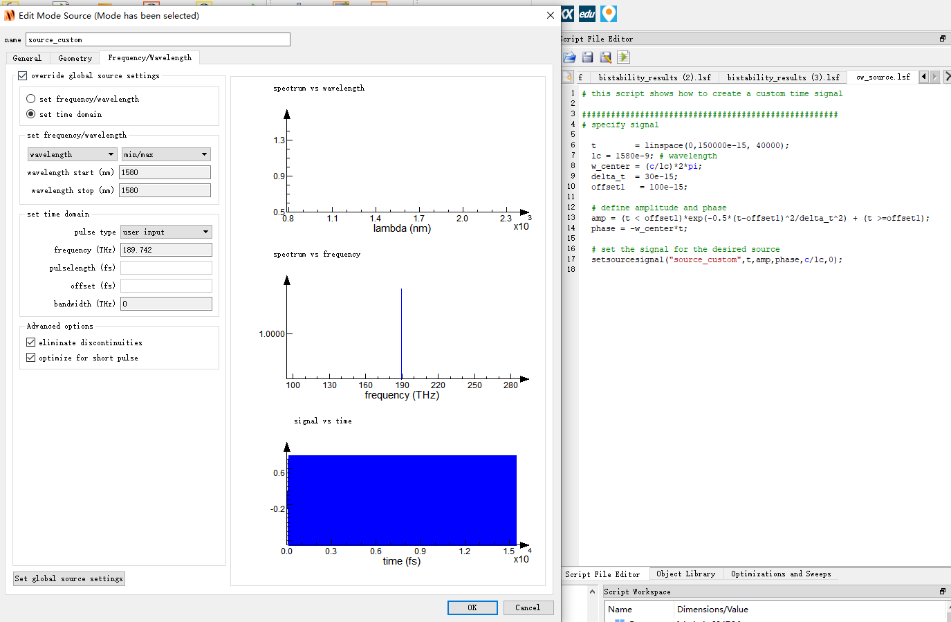/forum/discussion/comment/139776#Comment_139776感谢老师的回答,我是通过下面这个脚本改变source_custom光源的,不知道是否正确。原文当中是对这个结构的稳态特性进行了研究,他通过脚本将source_custom 设置成了一个随着时间变换source intensity的信号,这个intensity是不固定的,因此没有研究在线性和非线性情况下的透射率的对比。例子前面得到的频域结果是在线性系统中得到的,这种情况下直接通过监测器T就能得到透射率的图像,现在把材料改成kerr将source_custom enable后,也就是打开类似于其他文章中的pump光后的非线性系统中的透射率图像我就不知道该如何得到了。