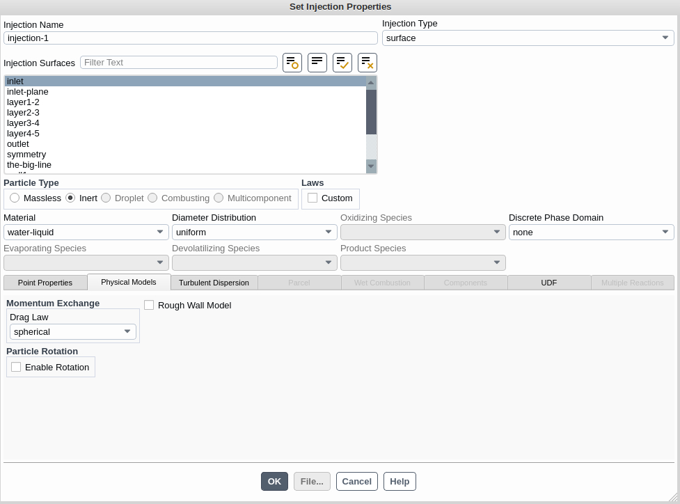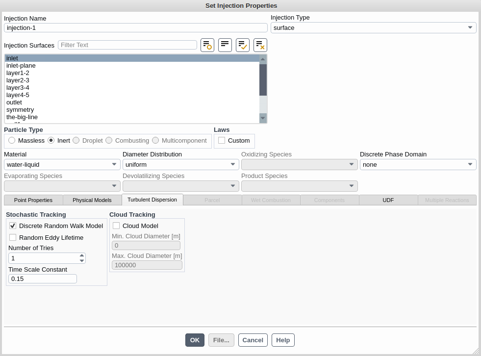 I am simulating particle capture in multi-layer screens in fluent using DPM. K-Omega SST model is used and DRW is added to the DPM model to see the impact of turbulence dispersion on the particle capture. I have defined multiple mono-size injection groups under the specified settings according to the attached photos. size of the smallest under-study particles is 50 nm and the largest size is 10 microns.