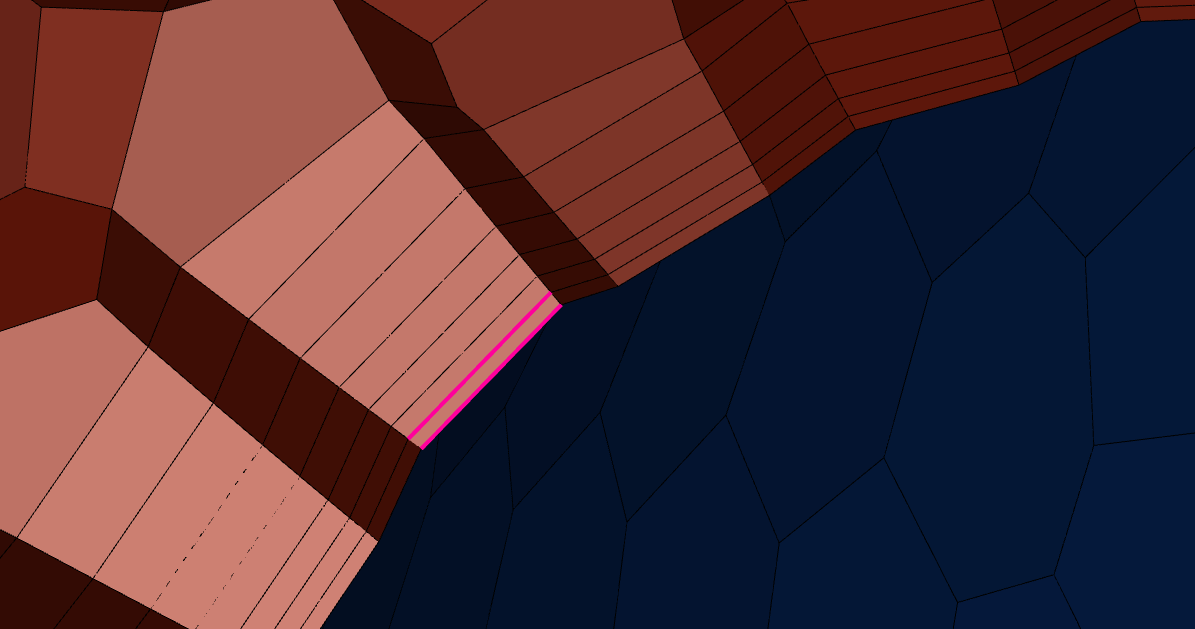 2- the particle entering the first mesh layer, right above the wall surface (the particle is marked as trapped as soon as it enters that mesh cell and no trajectory update happens in that cell)