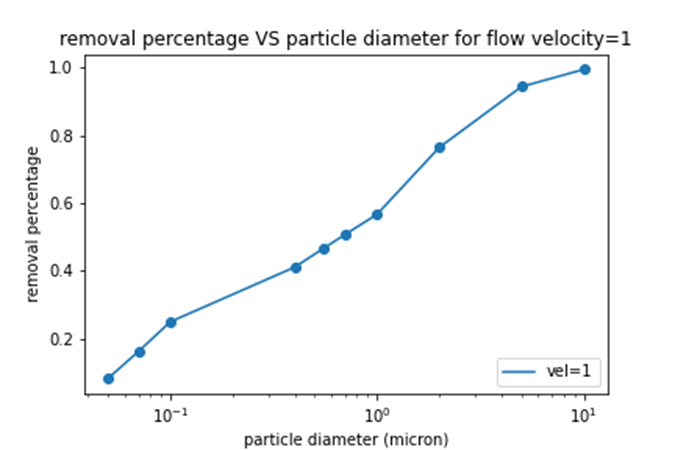 I currently observe about 60% removal of the 1-micron particles at 1m/s.