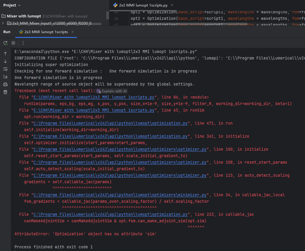 My code loads two separate scripts, each setting up one input source corresponding to 3 output monitors. The goal is to alternately optimize the device structure under two light sources during the optimization process. Therefore, there are 6 monitors and 6optentries in total in my code, not "setting two input sources in one script" as you mentioned. - Optimizer Error in v242