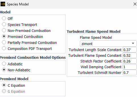 SubscriberIts premixed combustion. I use the default premixed setup with c equation and zimont model. My mixture is ch4+air and later i will try to add hydrogen. The model is at atmospheric conditions and it contains a combustion chamber with adiabatic walls(maybe later i will consider the wall heat exchance effects). For the inlet conditions, i took velocity and turbulence profiles from an experiment based thesis. I already run the steady rans models and results were satisfiying for a steady rans result.
