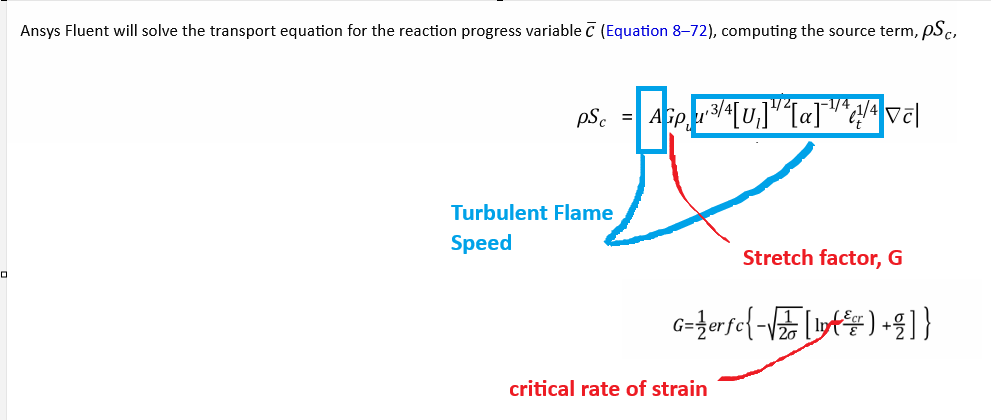 Critical strain rate is used to calculate the Stretch factor, G, which multiplies the turbulent flame speed in the calculation of the progress variable source term. Below is how turbulent flame speed stretch factor and the progress variable source term are related: