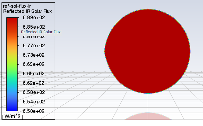 This bottom wall was set to 0 transmissivity and 0 absorptivity for this case, so it was expected that the solar radiation coming in (1377 W/m2) would be split between reflectivity in the IR and visible, 688.5 W/m2, which occured.
