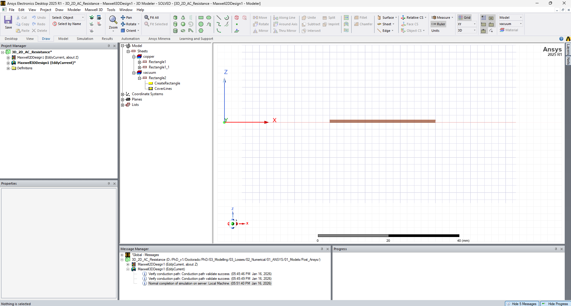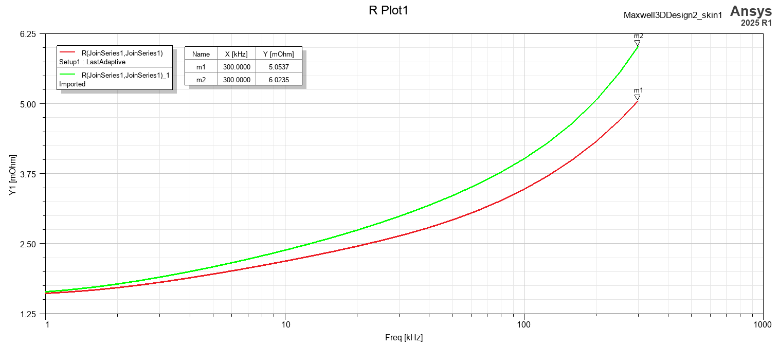 SubscriberI was simulating two simulations: Maxwell 3D and 2D cylindrical RZ in the Eddy Current solver. I found that the AC resistance is different in these two simulations when I am simulating planar windings with two layers. I set the mesh configuration in 3D to accurate. It is a simple two-layer winding, and I didn’t simulate it well.