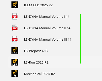 You can also check that you have installed LS-DYna, by seeing if these are installed and visible as shown below (in 2025R2 start menu folder):