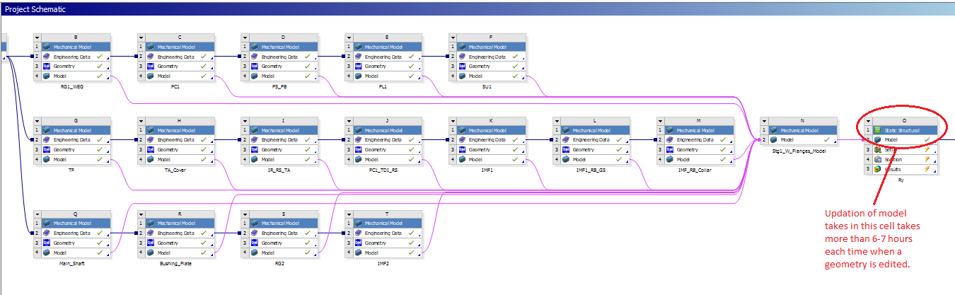 I am trying to solve a system level model in which I use the “Workbench assembly and transfer settings” as shown below. The problem is it takes more than (4-5 hours) when I integrate two or more systems as shown in the below screenshot. In the attcahed screenshot, updating the cell O2 (Model), takes more 6--7 hours. I understand that many sliced bodies and many named selections in the individual cells could be a reason. Secondly my inference is that Ansys tries to renumber the mesh nodes each time when an attempt to update is made and this can also be a reason for the sluggish update.