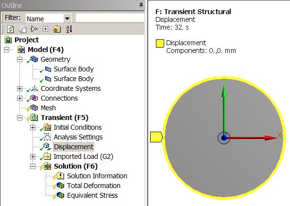 2- In Transient Structure; I have a boundary condition that the nodes on the outer circle is fixed, So i put (Displacement = 0 in X and Y) as well i tried to use the (Fixed Support) instead of (Displacement = 0) and found no difference in result.