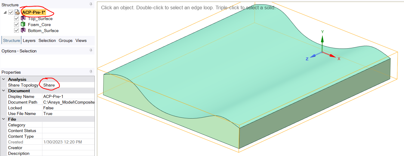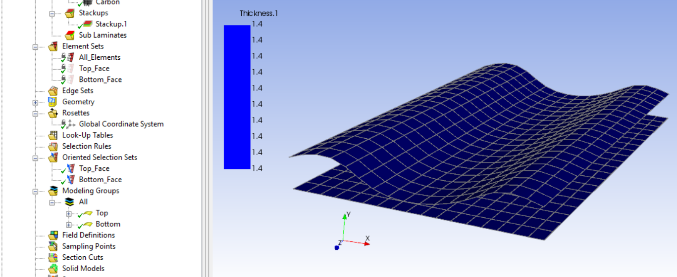 Yet another way to do it is to build the composite layup and foam core on a surface like we were doing. Then create a 3D model of the finished composite sandwich, mesh it, and import the 3D solid mesh in ACP to map the composite layup onto the solid mesh. You will find more information about this technique in the help: