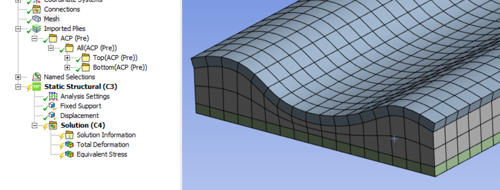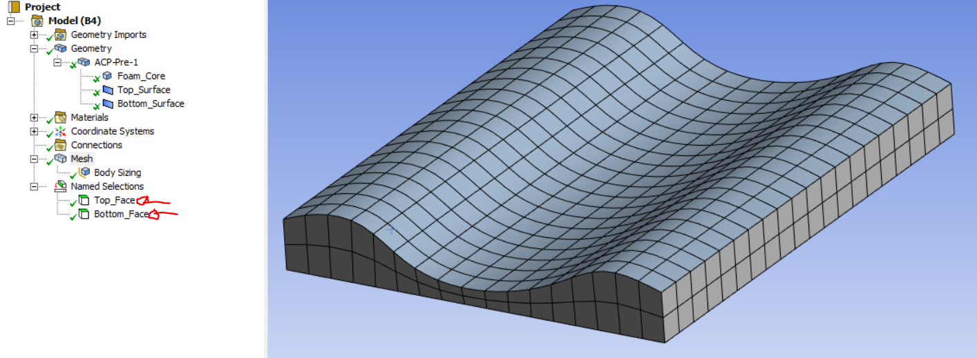 Then, you create named selections in Mechanical for each region. The named selections will transfer to ACP as element sets. You can then use the different element sets to create the Oriented element sets needed to build the layup. This is the best way because if you refine the mesh in Mechanical, the element sets will update properly based on the named selections in Mechanical. Let me know if you have questions about this process.
