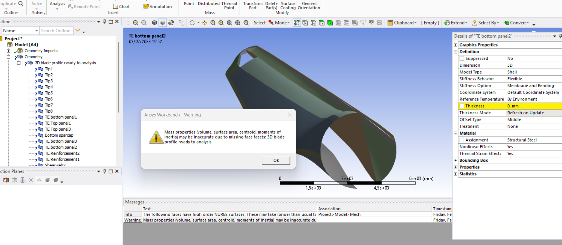 I modeled a wind turbine blade using surface elements in space claim. I want to perform a model analysis of the blade, so I import such a model to the design modeler. While opening the model file to generate mesh to my model, some elements are not shown in the window(as shown in the attached screenshot), and some element are extra added to the element tree. How can I solve this issue?