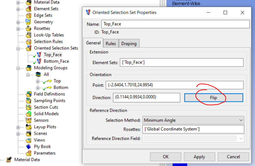 With the Oriented Selection set, you can specify the layup direction to add plies on both sides of the surface (shell elements). You can create another Oriented Selection set and flip the direction to apply a ply on the other side of the surface: