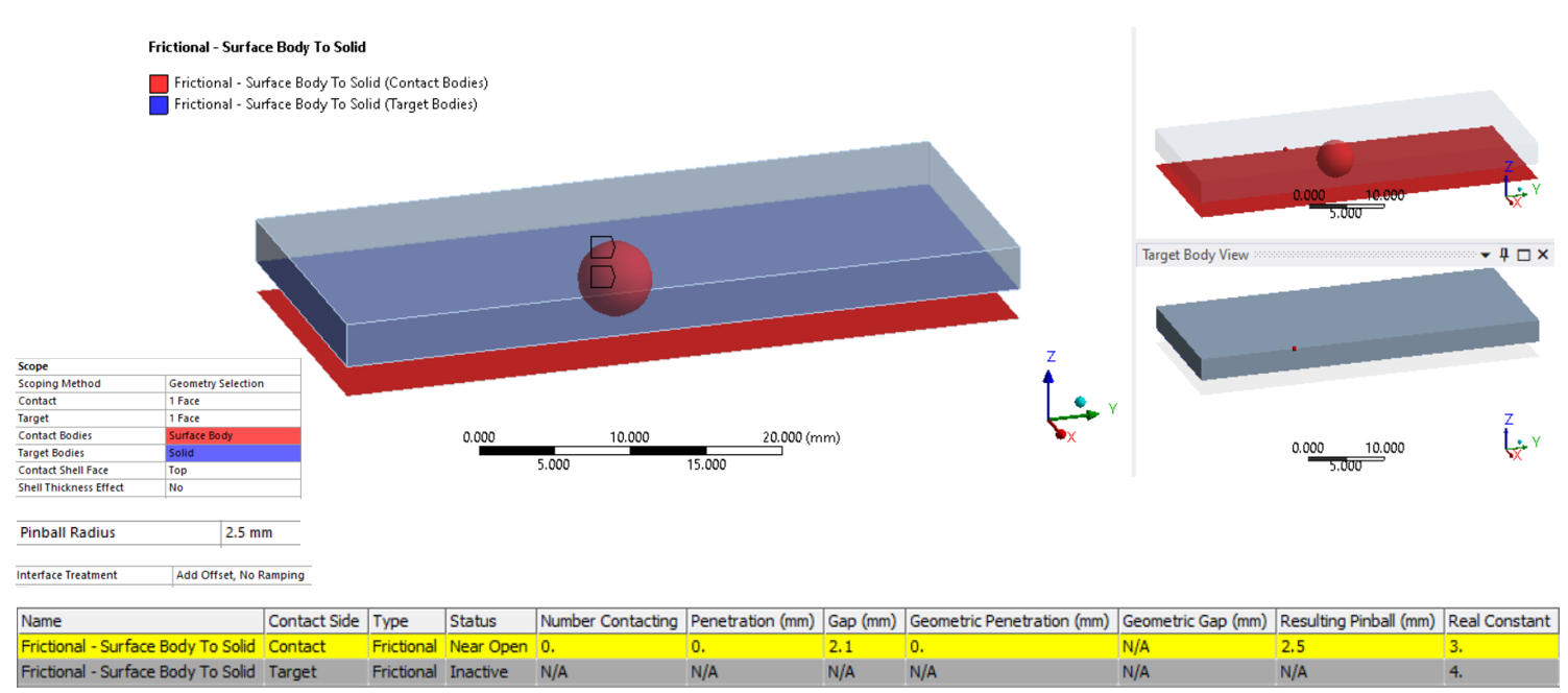 I think you are assuming that I am choosing the top face for the surface body as target, while the bottom face of solid body is contact. What if I keep the bottom face of the solid body as contact, but change the target face to be the bottom face of the surface body. I know this doesn't make any sense, but why not do it for the sake of understanding. Now, the pinball radius is kept at 2.5 mm implying that the frictional contact will get detected. But what would the gap be now? And what would adjust to touch do now, here?