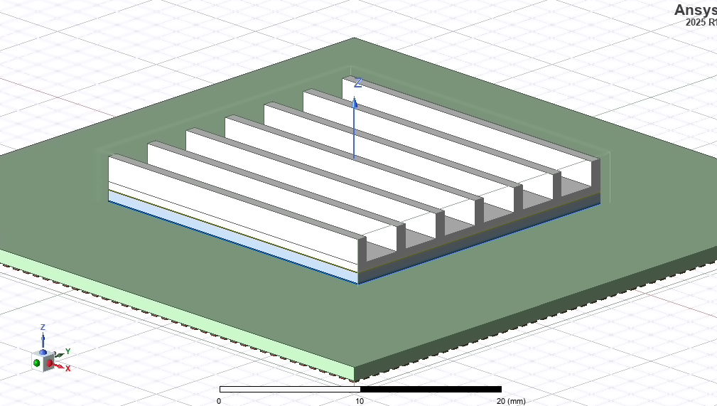 - On top of the TIM1 layer, there is a Heatsink with 7 fins. Heatsink base (X = 25mm, Y = 25mm, Z=0.6mm) and each fin (X = 25mm, Y = 0.85mm, Z=1.9mm)