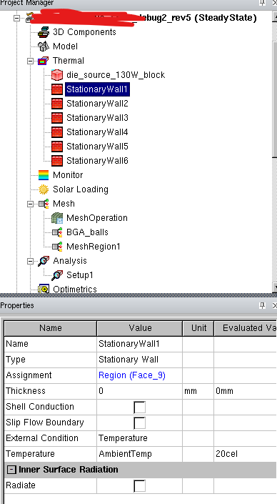 Afterwards, I tried to add mesh regions: one region for BGA balls, Die, Heatsink, Substrate, TIM1 and Underfill&Solder respectively. I extended the mesh region boundaries of BGAballs, TIM1 and Underfill&Solder so they are not aligned with the corresponding objects (e.g.I extended the mesh region of TIM1 by 0.1mm outside the TIM1 object). I define advanced meshing with the following parameters for TIM1: