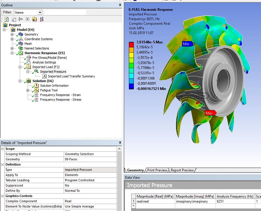 I am studying on full harmonic forced response analysis for Aeromechanical and Life analysis of a Fan rotor blade (seen in attachment). I used external data module to map real and imaginary pressure distribution which is coming from CFX-calculated unsteady rotor-stator disturbance on fan rotor blade