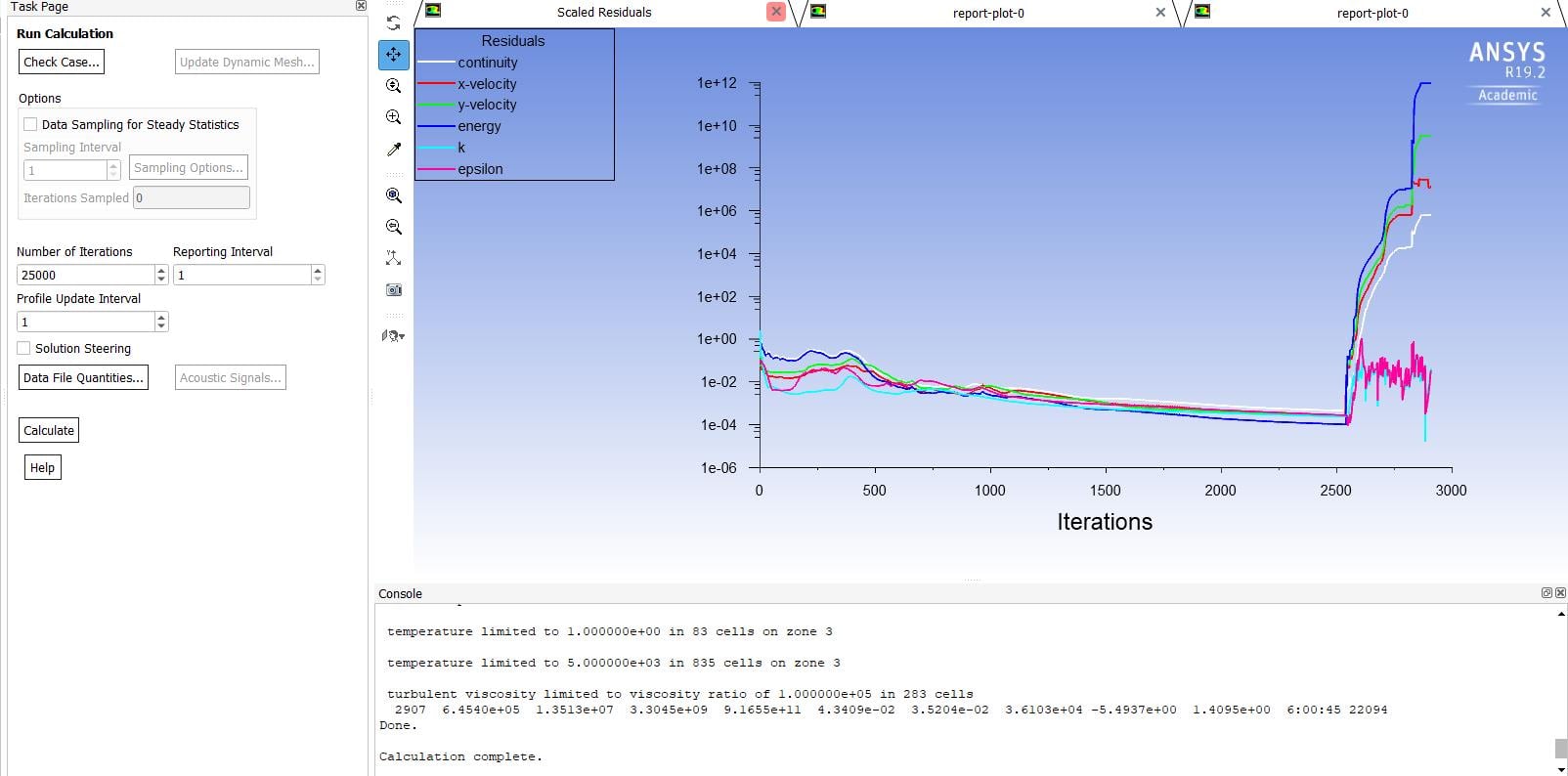 This are the residuals from my latest simulation. After the spike at 21500 iterations I tried to reduce the Courant Number and the URF, but it didn't help. However, I noticed that the residuals started to rise again when the massflow at the inlet equals the massflow at the outlet. When I started the simulation, both were negative and then they slowly started to converge. At 21500 iterations the massflow at the inlet was equal to the massflow at the outlet (with a different sign) and then the residals explodes and I get the message that temperature, absolute pressure and turbulent viscosity ratio are limited.