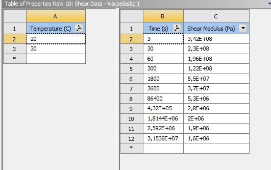 SubscriberI am modeling a visco-elastic behavior. I insert the Shear Data (Shear Modulus-Time) for temperature of 20° and 30°C and I get the Prony Shear Relaxation data after solving the curve fit. But as mentioned on a previous post, I think that curve fitting is not working properly; why do I think so?