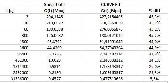 Ansys EmployeeWhere are you getting your instantaneous shear modulus from? What I was suggesting is that the G0 (instantaneous shear modulus) in the equations that you shared should be the peak shear modulus from the time-dependent shear modulus curve. Even if you're getting the G0 value from some other experiment, use the max. value from the curve for verifying the fit since the G0 value that you may have from other experiment is not used during the curve-fitting stage.Â