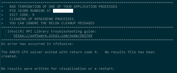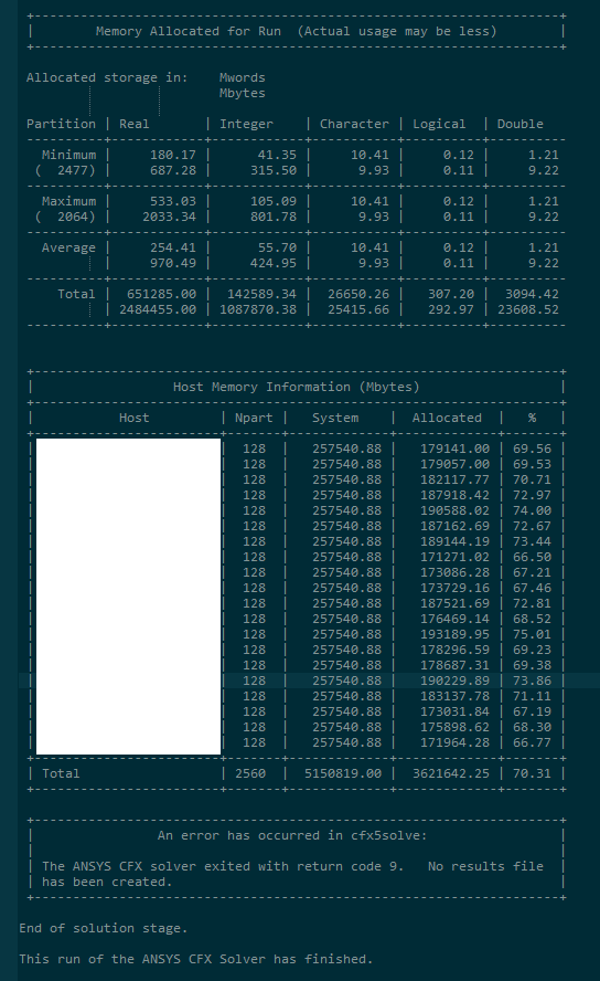 SubscriberHi SD Thank you for the suggestion. I had a different core count job queuing and was waiting on the results (25% increase in requested nodes/allocatable memory). This job has also returned code 9 on exiting. I had also reached out to someone within the research computing department and they mentioned the signal 9 is most commonly associated with an out-of-memory watchdog. In fact, when digging into it a bit more, they were able to tell me that run20 from above had actually returned a different exit code associated with an out of memory state within our job scheduler that was not reported to either the CFX out file or to the console* out file.