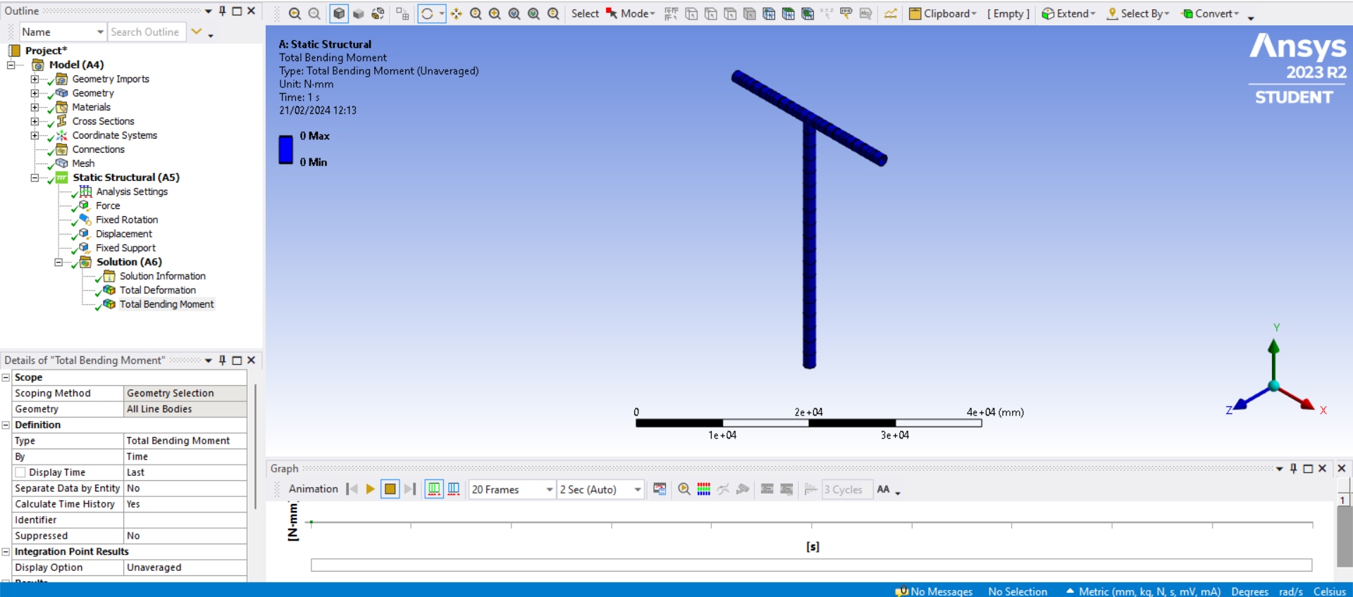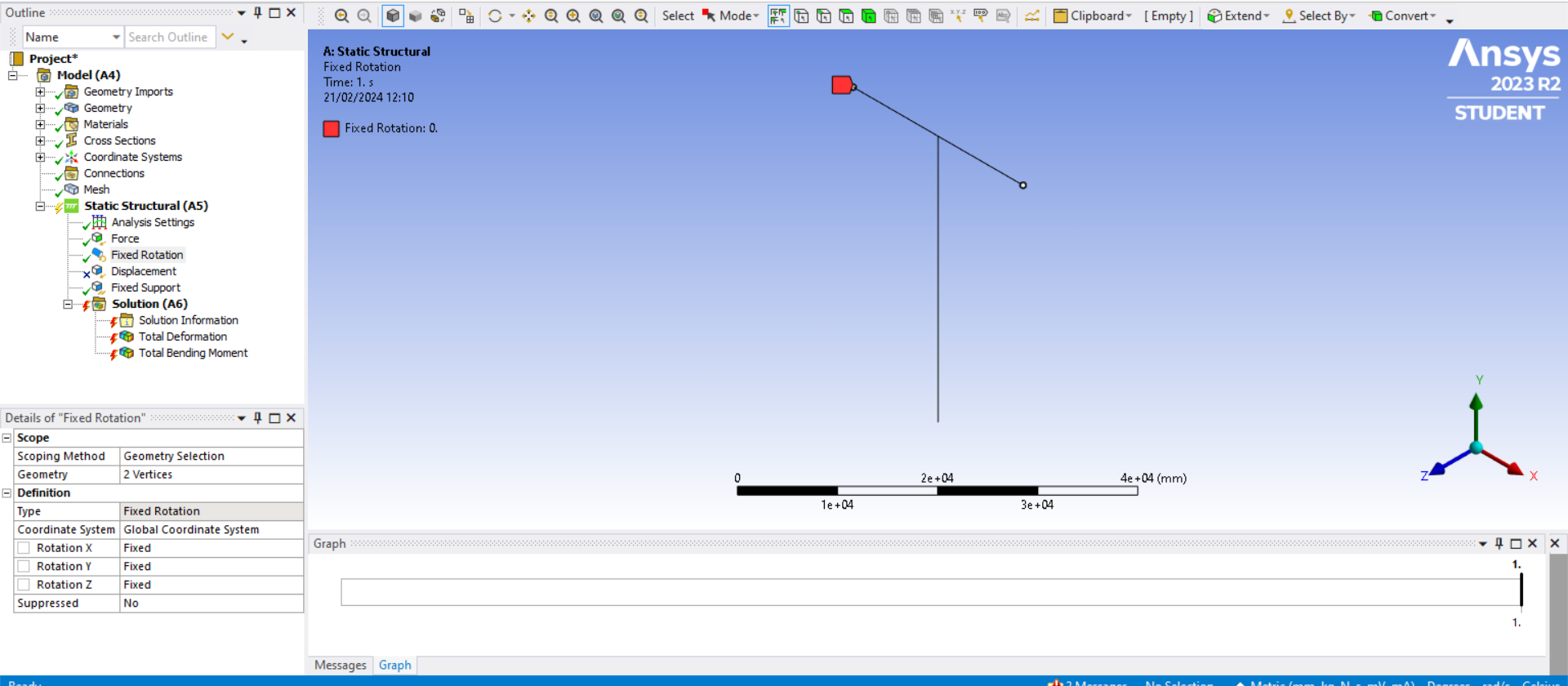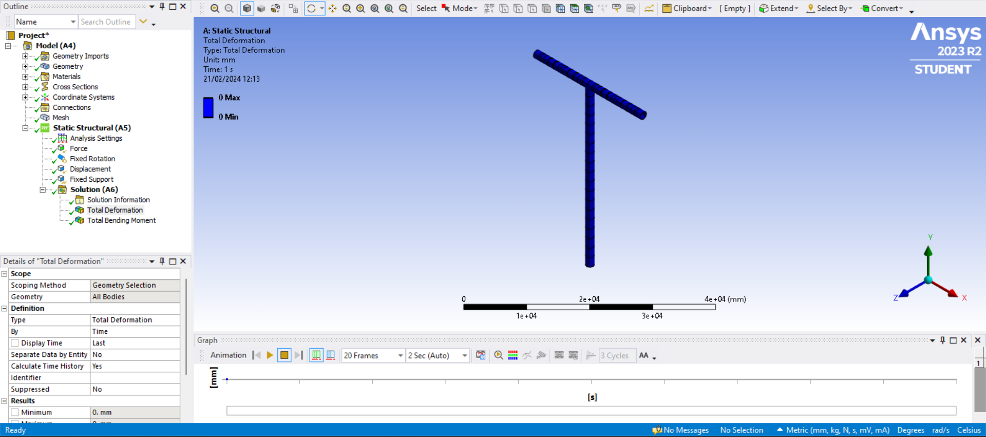 SubscriberHi, I am trying to model a very basic T-pylon structure. I have to apply 0mm displacements in the x, y, and z directions and also apply fixed rotations in all axes for it to be able to solve. But when I solve with these constraints the total deformation is equal to zero and so is the total bending moment no matter what size of force i apply on the sturcture. But if i try take away the displacements and fixed rotations i get the following error: