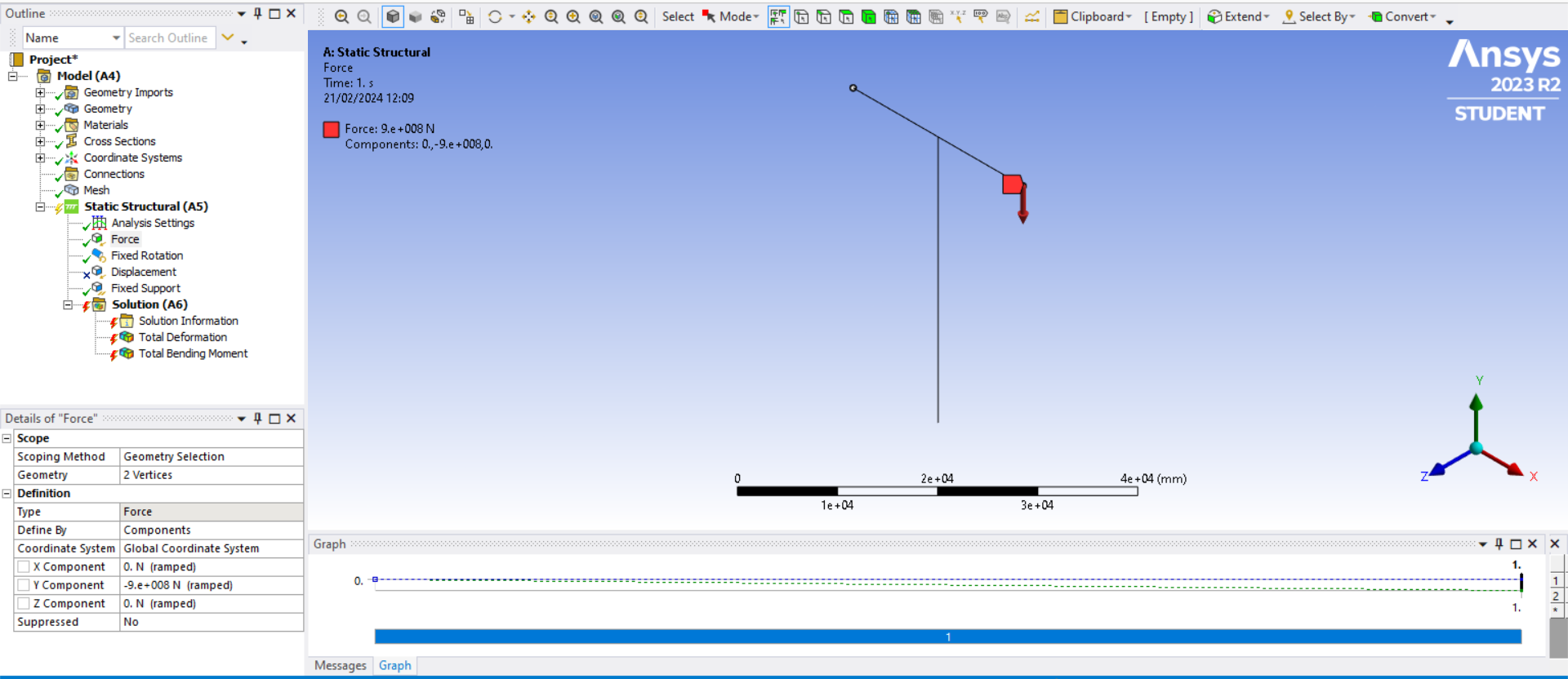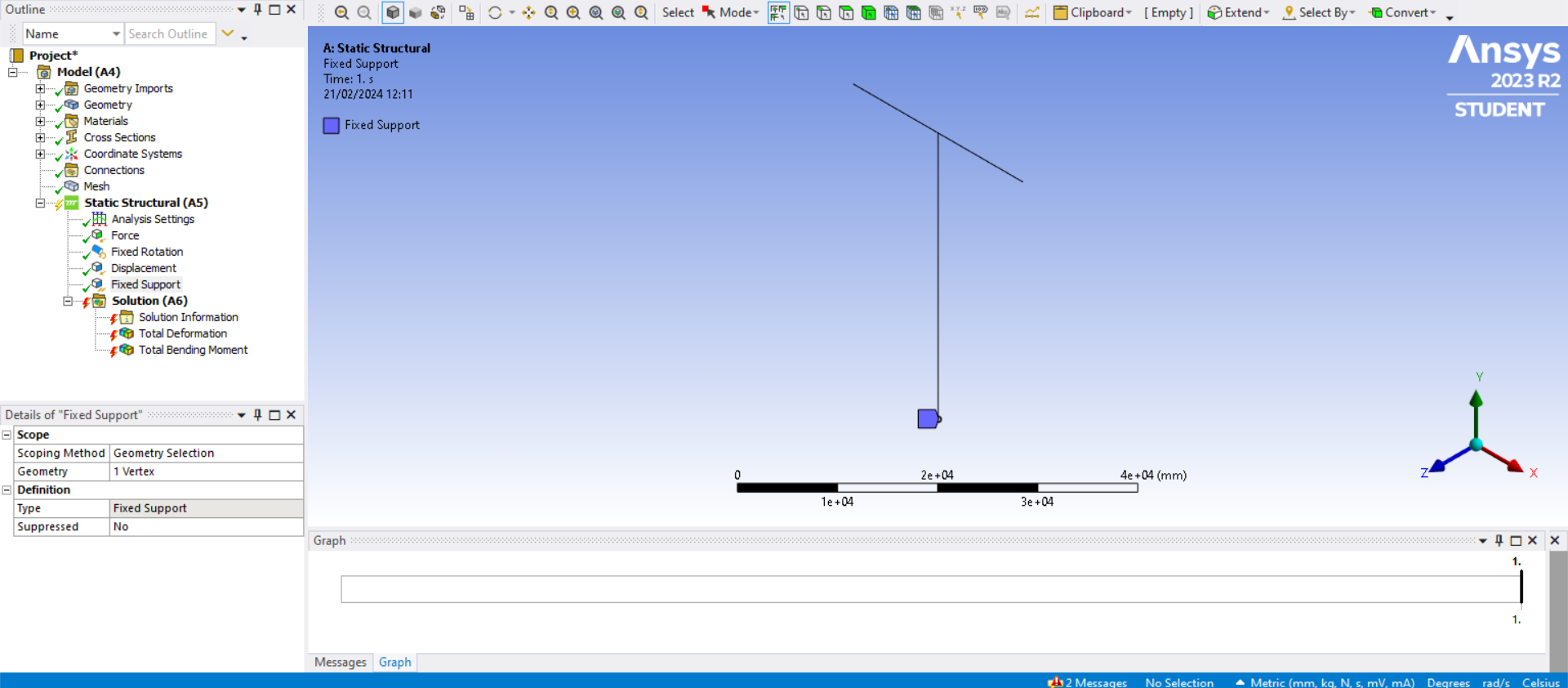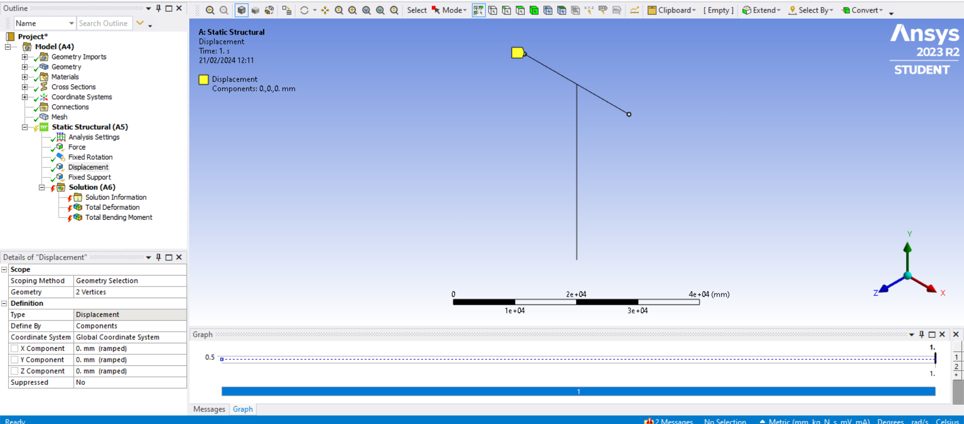 SubscriberHi, I am trying to model a very basic T-pylon structure. I have to apply 0mm displacements in the x, y, and z directions and also apply fixed rotations in all axes for it to be able to solve. But when I solve with these constraints the total deformation is equal to zero and so is the total bending moment no matter what size of force i apply on the sturcture. But if i try take away the displacements and fixed rotations i get the following error: