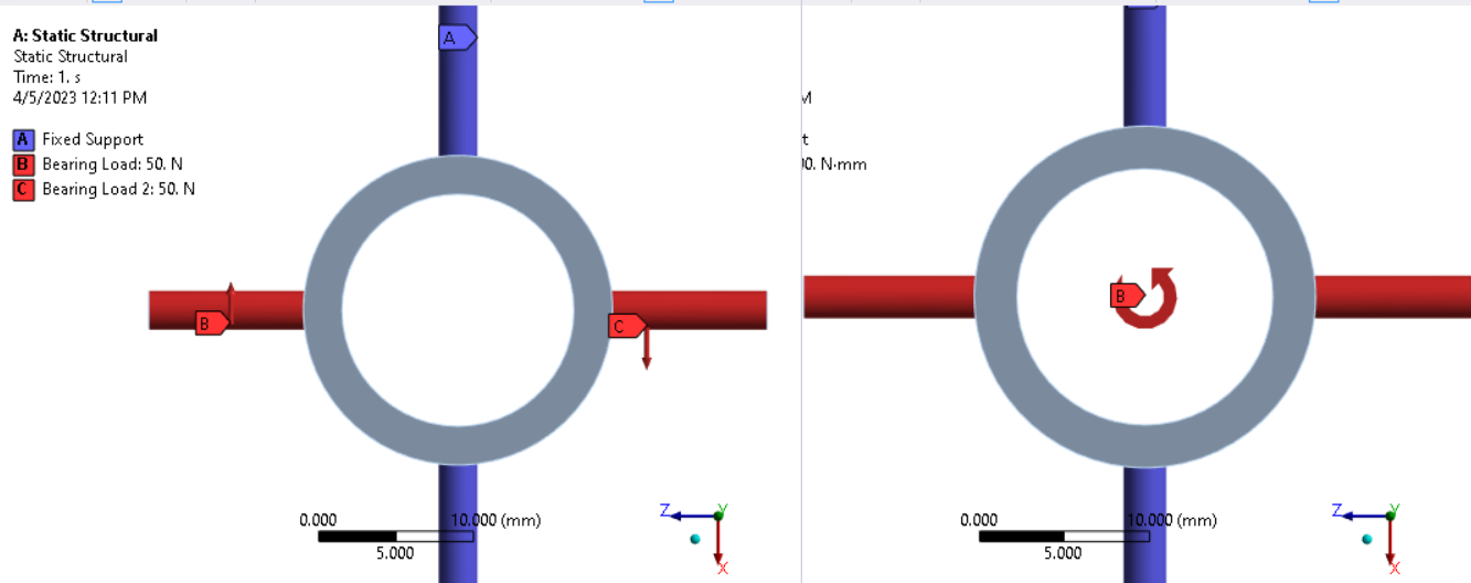 When applying the loads and boundary conditions I tried applying them as components rather than as vectors to get an essence of the situation.