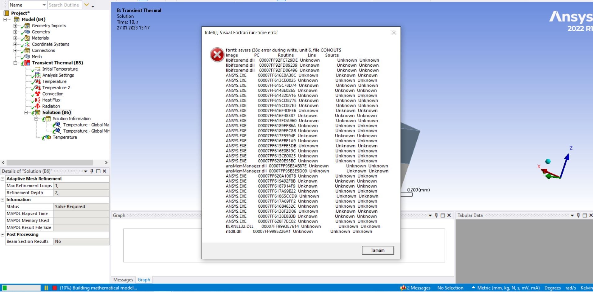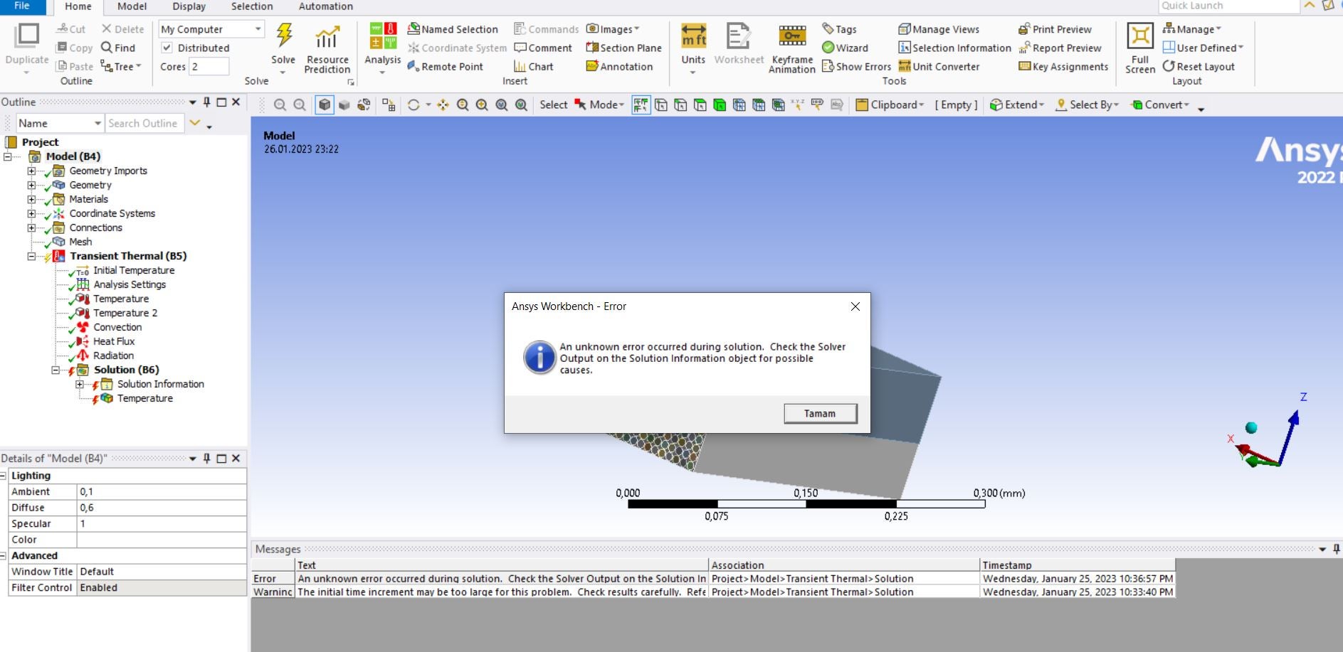 Ansys EmployeeAs the message suggests, please go to Solution > Solution Information > Solver Output. Search for "Warning" or "Error" keywords in the text and copy any relevant messages that might help us understand what is going wrong.