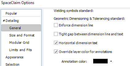 A customer would like to have some dimension annotations in a drawing sheet be displayed vertically, while some remain horizontal. We are aware of the "Horizontal dimension text" annotation option in SpaceClaim Options. Unfortunately, this "global" setting does not provide the flexibility desired by the customer.