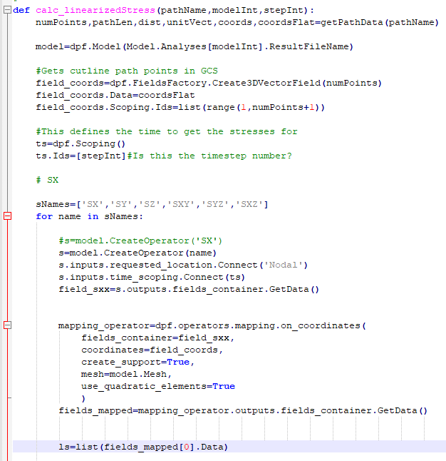 I know when you plot a normal stress in Mechanical (not linearized), you can choose different types of averaging of the results. I don't see that option for the linearized object. So my question is: what is the difference between what DPF is doing versus what mechanical is doing to obtain the stress along the path at the discritized locations? Below is a snapshot of the DPF portion of the script for reference.