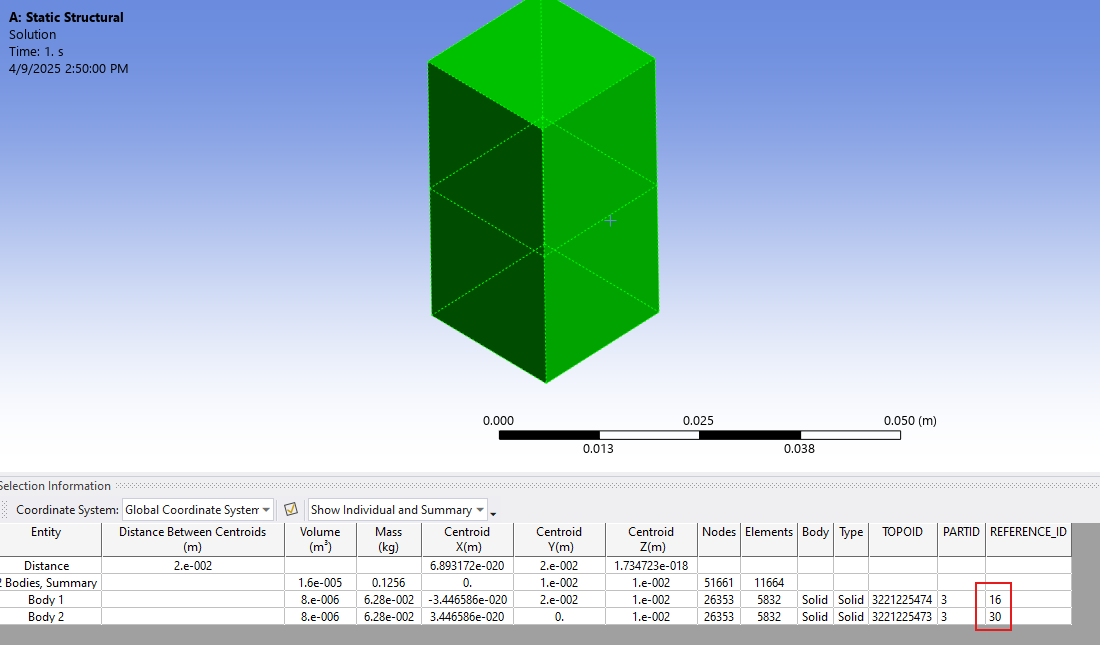 However, if the Path is defined on an edge (for example) which is shared between two bodies, the Path results are considered from the nodes of one of the body, which has higher geometry ID (internal ID which can be displayed when selecting a geometry and clicking on Selection Information) as shown below. The example here shows that I selected two bodies and I can see from the selection information that the IDs are 16 and 30. Hence, if a path is scoping one of the edges shared between these two blocks, the results are taken from Body with id 30. However, DPF or APDL will get averaged result. You can verify this by scoping only the body with highest id when scripting with DPF to match the results between DPF and Mechanical.Â