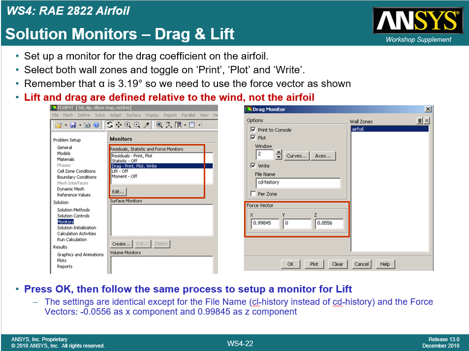 Thank you for your response. I am aware that there is no RAE2822 transonic case in the current Fluent materials. When I search for 'rae 2822 fluent tutorial' on google there are multiple versions of this document, some of them have the 'Tutorial XX' replaced by 'WS4' as the example I have attached below. The slide with adjusting the force monitors X and Y coords is in and looks like this -