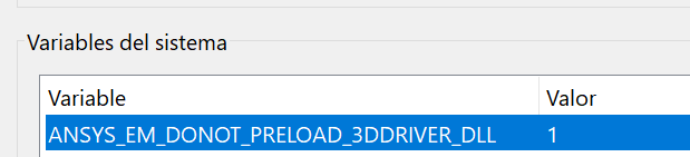 SubscriberFor those who has tried the above but no luck yet, please try the followings:nOpen up Command Prompt -> Run as AdministratornSend two commands to set the environment variablessetx ANSYS_EM_DONOT_PRELOAD_3DDRIVER_DLL 1nsetx ANSYS_EM_DONOT_PRELOAD_3DDRIVER_DLL 1 /mnnThis should work.nnTimnOctober 19, 2020 at 11:23 amedaakar