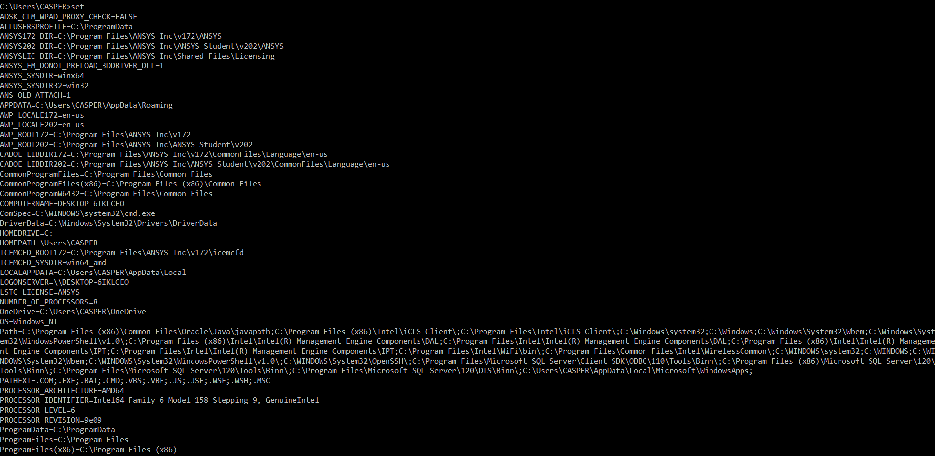 Forum ModeratorPlease run the set command from a Windows command prompt and send the full output. Omit the from the command.nnThanks,nMattnOctober 19, 2020 at 1:40 pmOctober 19, 2020 at 1:55 pmANSYS_MMadore