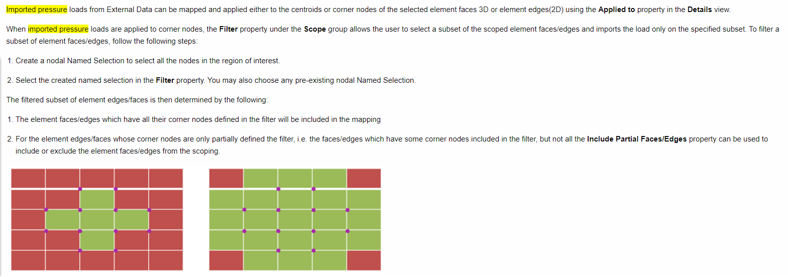 Ansys EmployeeThe imported pressure doesn't take nodal named selection but the filter option does. You can select a larger face area using geometry selection and then under the filter option select the nodal named selection. This way the imported pressure would only be applied to the nodal selection. Check the image below. I have scoped the imported pressure to all faces of the cuboid and then selected a subset using filter option scoped to a nodal selection.